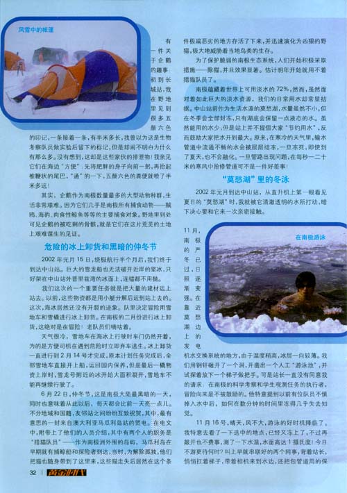 2003年元月16号那天,尝试了一下,虽然只游了三十多米,仔细算算,应该能游过去。可是,第二天,载着十九次科考队队员的直升机就上站了,我再也没有机会游泳了,这多少留给我一个不大不小的遗憾。