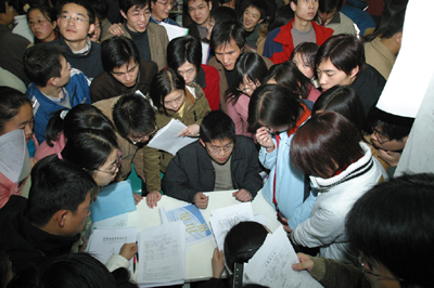 2月9日,陕西省2004年首场大型电子类毕业生专场双选会在西安电子科技大学举行,吸引一万多名毕业生相互择取选材。 (王凯,秦明,安涛摄)