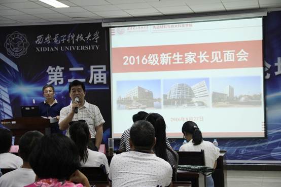 下午3点,2016级新生见面会在G楼118报告厅举行,学院党委书记黄伟、执行院长史小卫、院长助理李智敏、办公室主任卢琳、团委书记刘男、新生辅导员田志伟、新生班主任周雪皎和吕玲以及百余位新生家长参加了见面会。会议由史小卫主持。
