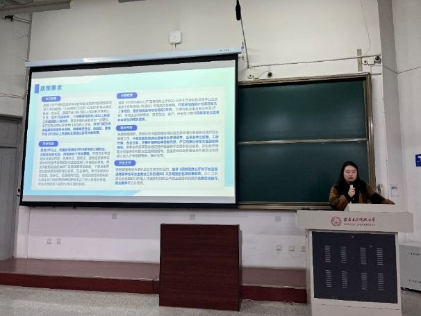校团委副书记王佳悦从基本情况、报名流程、政策要求以及常见问题解答等四个方面介绍了“西部计划”志愿服务项目,对服务专项、主要服务地区、选拔标准等内容进行了全面详细的解读。同时,她鼓励毕业生们积极投身西部建设,为国家发展贡献力量。王老师深入浅出的讲解,为同学们提供了宝贵指导,明确了准备方向。
