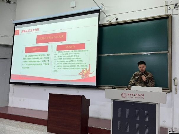 武装部干事郭成以“热血铸军魂”为主题展开2025年参军入伍政策宣讲。郭老师不仅详尽解读了最新的参军政策与流程,还以生动的案例讲述了往届直招军官和退役大学生的真实经历,通过与空军某部直招军官的现场连线、退役大学生的主题分享,鼓励同学们积极投身强军国防事业,勇敢追逐军旅梦想。
