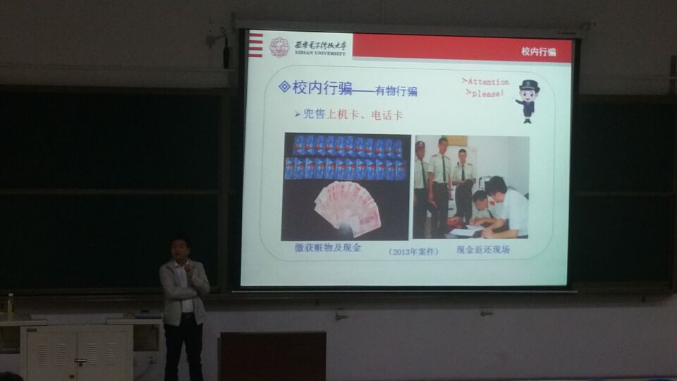 魏老师首先为同学们介绍了近年来学校发生的一系列安全事件,指出了校园安全工作的紧迫性和必要性。随后就诈骗、盗窃、用电安全、信息安全等各方面问题进行了详细的阐述。讲座过程中,魏老师通过幽默风趣的语言,向同学们列举各类常用手机APP如淘宝、支付宝、微信等所引起的诈骗案件,警示同学们对待虚拟空间交易要谨慎。在盗窃问题上,魏老师采用现场模拟的方式,生动的还原了大学食堂手机盗窃案的现场。“公共场所要靠自己”,魏老师告诫同学们在譬如宿舍、操场、食堂等公共场所要做到贵重财物不离身。最后,魏老师强调了宿舍安全问题,特别之处在宿舍使用大功率电器的火灾隐患。