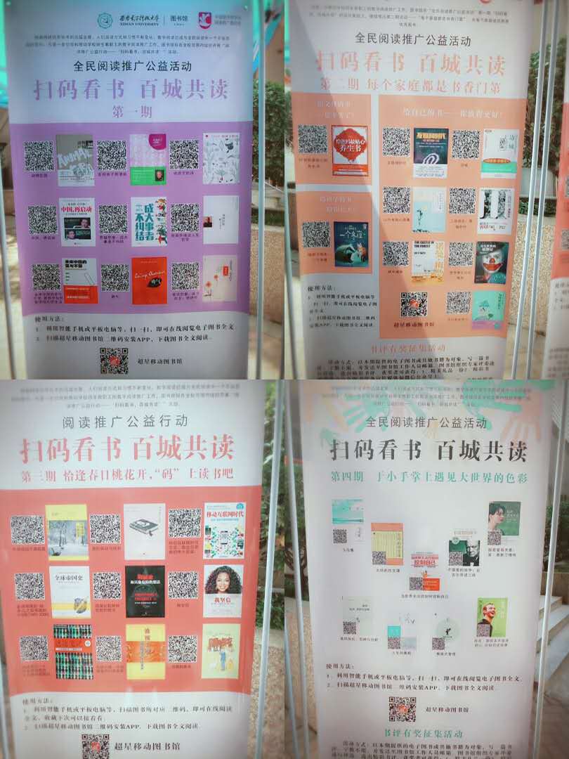 西电新闻网讯(通讯员 孙晓化 张宁)倏忽人间四月天,4月27日,图书馆4·23世界读书日系列活动之“扫码看书,百城共读,在校园”全民阅读推广公益活动在老校区西军电餐厅门口举办。下午4点,活动圆满落幕,获得了学校师生的一致好评,图书馆将继续努力为读者更为优质的服务。