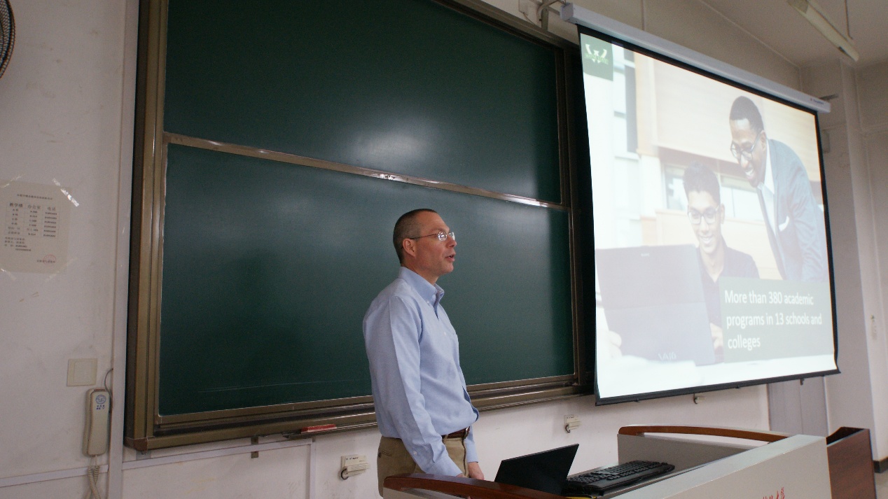 Loren Schwiebert博士对学校的热情接待表示感谢,并祝贺西电在创新创业教育方面取得的成果。随后,他介绍了韦恩州立大学的概况,并从师资规模、学生就业率、获奖情况、课程设置、研究方向等几个方面详细介绍了工学院及计算机学院的情况。他表示,西电在信息与通信领域具有突出的学科优势,希望两校通过签署合作交流协议,在教学、科研、师生交换领域开展更多互利互惠的交流与合作。