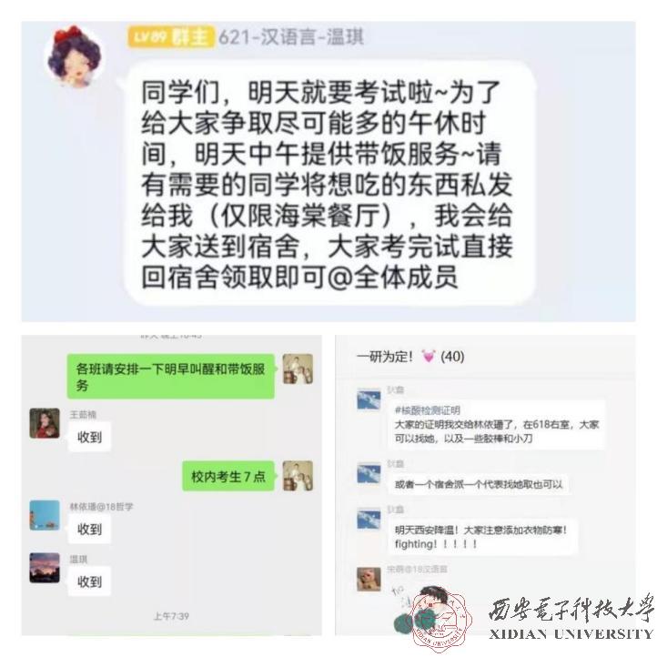 考试前夕,人文学院2018级学生干部为考研同学们贴心服务,积极统计信息、整理材料,帮助同学们完善筹备考前准备工作;考试当天早晨7点,各班负责人准时为应考同学们提供叫醒服务,并暖心提醒应考同学添加衣物,做好防护措施;为给同学们争取更多午休时间,班级组织提供带饭服务,为每一位考研同学提供全面而温馨的保障帮助。