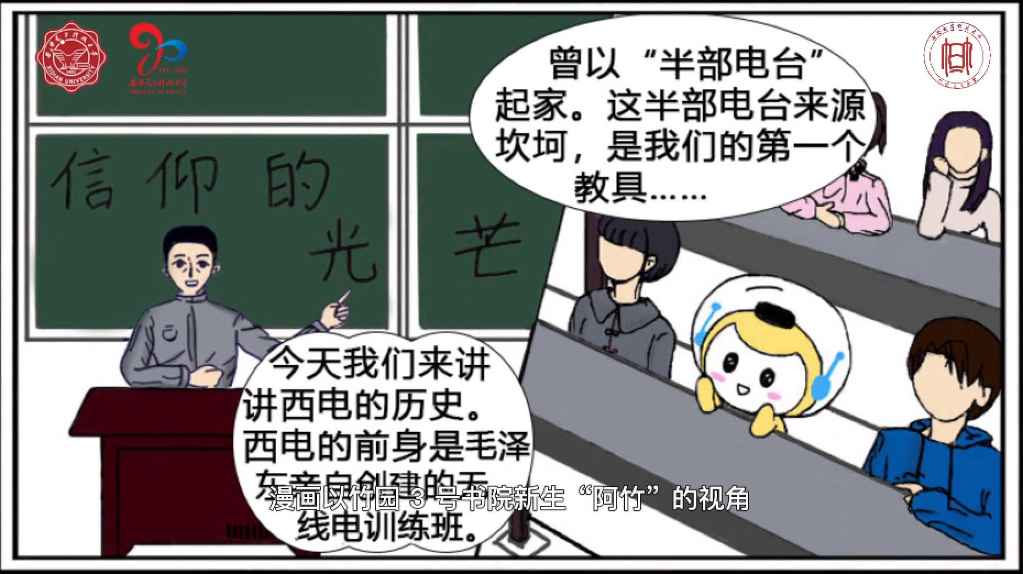 《手绘校史——毛泽东与西电的故事》是由竹园3号书院“不秋草”文创团队联合档案馆/校史馆/博物馆推出的系列红色主题漫画。漫画以竹园3号书院新生“阿竹”(竹园书院吉祥物)的视角,亲身体验了红军长征路上的坎坷与挫折,见证了西电从“半部电台起家”到“长征路上办学”,再到新世纪蓬勃发展的光辉历程。在此基础上,“不秋草”文创团队协同“听我说”朗诵团合作进一步将漫画视频化,创新形式讲述西电故事。