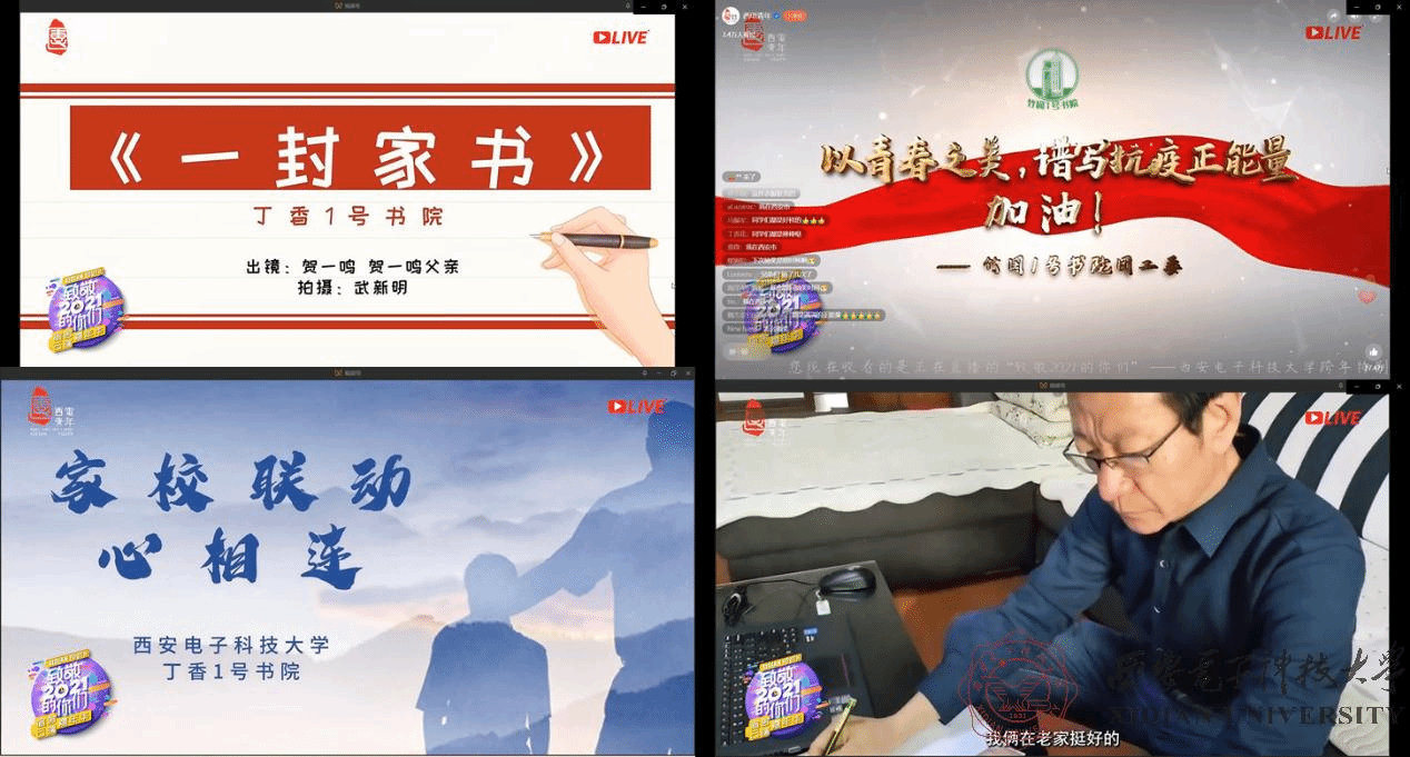 家校联动双院协同,守护每位同学平安健康。近期,一位家长写给孩子的信火遍全网,传递着温暖的感性与无尽的能量,信中写到“我们不担心你在西安的生活,我们相信在全国人民的支持下,在西安人民的努力下,你们一定平安无事。”来自丁香一号书院的同学书写了一封回信,写道:“爸爸妈妈,我很好,我的肩膀早已扛起责任和重担,请勿挂念,期待胜利,期待回家。”身处祖国各地的学生家长通过视频的方式为西电学子送上祝福与鼓励,稳固着战疫胜利的内心防线。