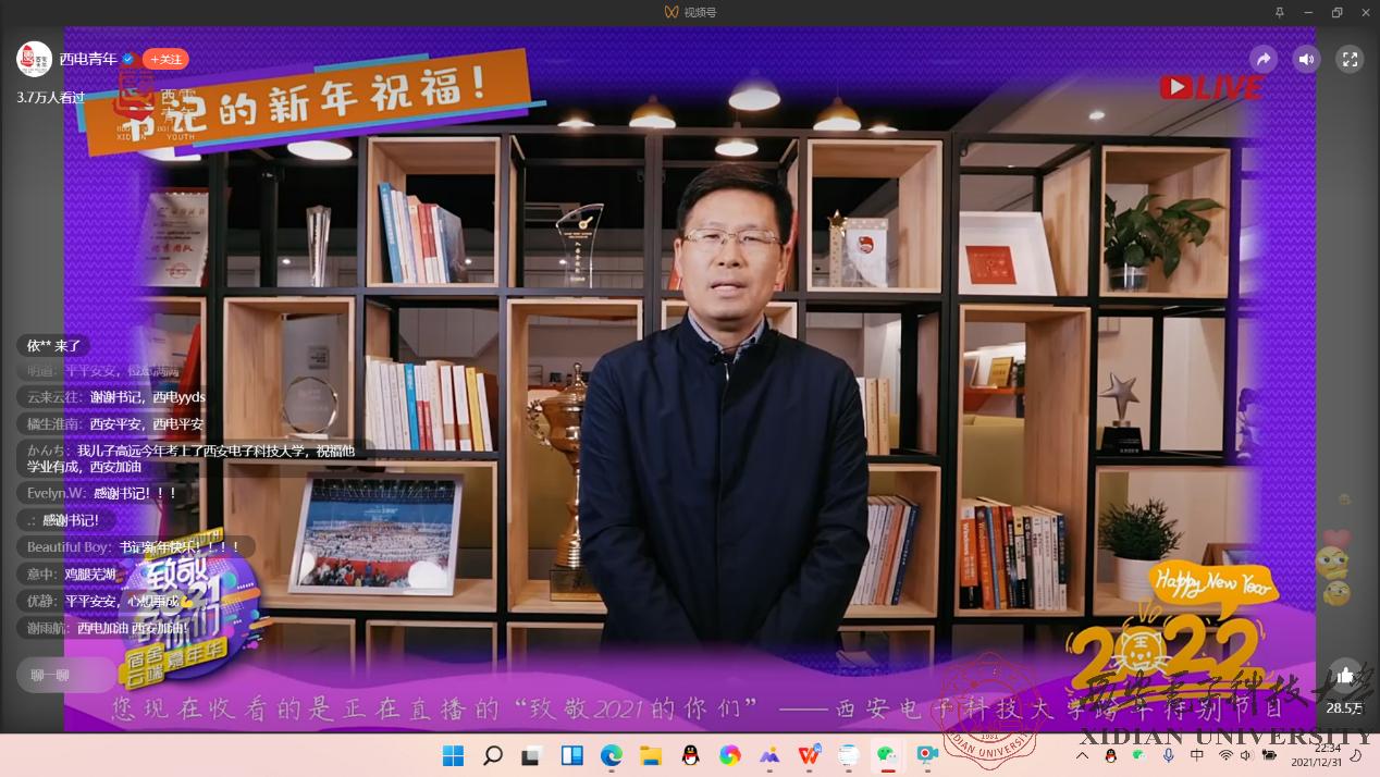 西电新闻网讯(通讯员 尹鹏 王冠玉)“愿与梦相约、与心飞翔,共同为2021的句号添一笔快乐的墨点,为2022的新章加一页快乐的开篇”,12月31日,西安电子科技大学团委、党委学生工作部、党委研究生工作部联合在线开展“致敬2021的你们”宿舍云端嘉年华活动,在特殊时期通过特别方式,充分展示师生同心抗击疫情的态度和行动,传递战疫终将成功的信心与决心。活动于18时通过西电青年视频号上线,开播6小时在线峰值人数达15645人,累计观看人数4.5w,获得点赞32.3w次。