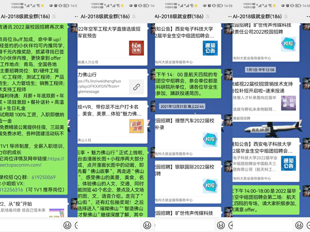 2018级有个专门的就业群,是杨坤在2021年6月份创建的,专门用于发布就业相关信息。疫情期间,就业工作从未断线。白天,杨坤会及时在就业群发布各类招聘信息,主动与就业困难的同学谈心,向用人单位推荐毕业生,到了晚上他会及时梳理就业台账,分类整理当天的邮件,还会帮部分同学修改简历。考研结束后,他也第一时间通过微信小程序向参加考研的近200人收集信息,掌握大家的考研情况,为后续工作的开展做足准备。