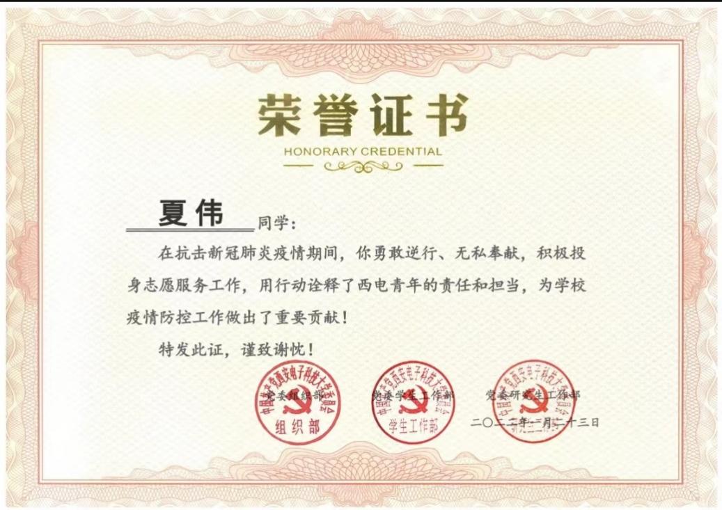 一位学生转换成一位“志愿者”只在那一瞬间,只因为学校的召唤。2021年底,夏伟积极投入学校抗疫任务。他主动参与核酸信息统计等志愿服务工作,充分发挥党员先锋模范作用,在担当中历练,在尽责中成长。